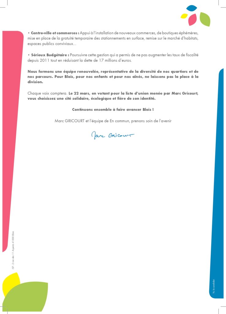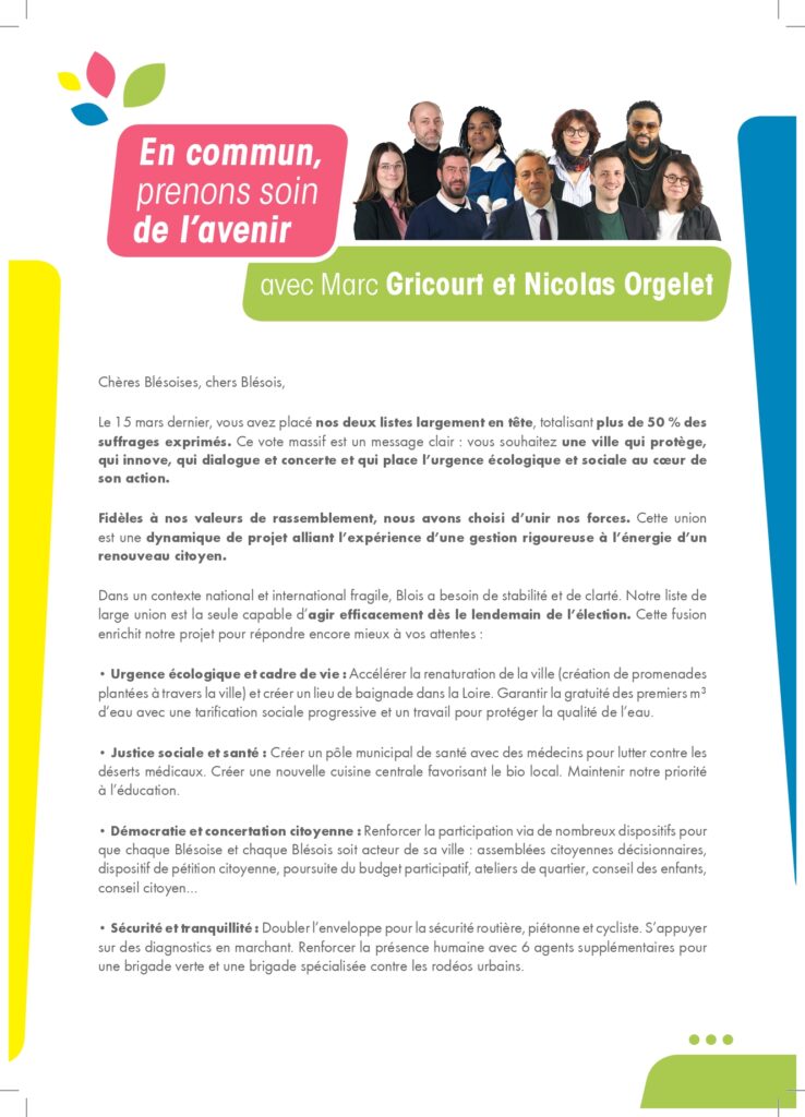 En nous plaçant en tête, vous confirmez votre aspiration à une ville toujours plus protectrice, solidaire, tolérante, juste. C’est l’enjeu de notre programme proposé aux Blésoises et Blésois. Une plateforme programmatique de priorités traduites en 50 propositions concrètes qui nous engagent avec l’objectif de continuer à développer durablement notre ville et de bien